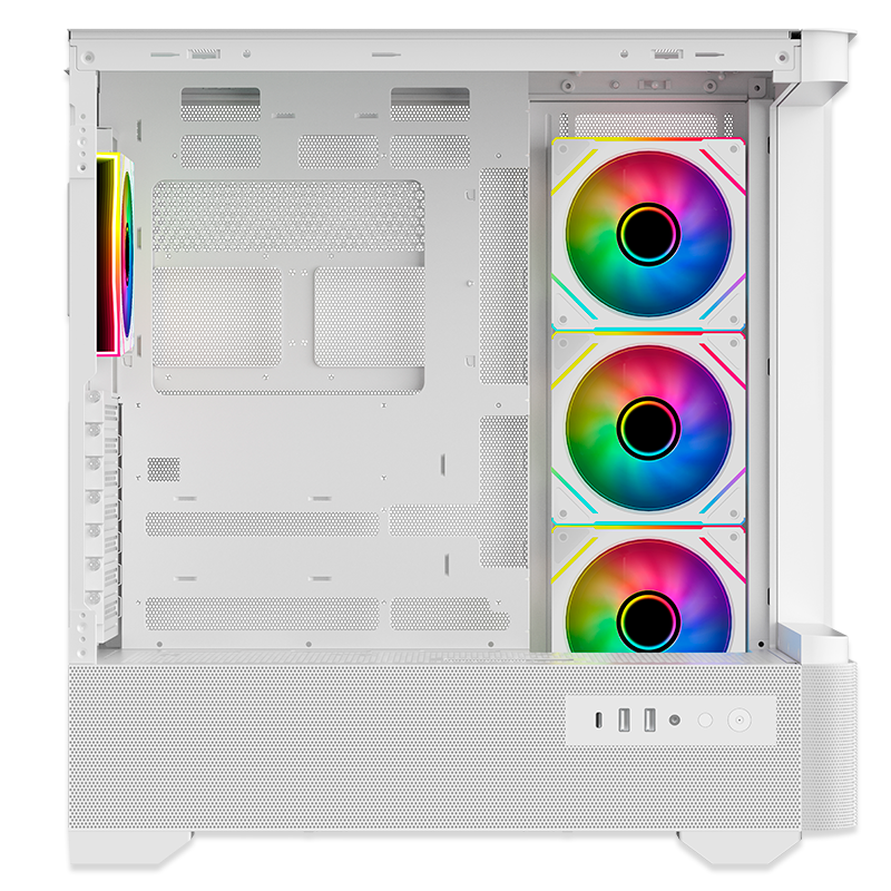| Puertos de ventilador: Lateral 3 x 12cm (ventilador ARGB efecto infinito instalado x 3), trasero 1 x 12cm / 1 x 14cm (ventilador ARGB efecto infinito instalado x 1), superior 3 x 12cm / 2 x 14cm (opcional), inferior 3 x 12cm (opcional) |
