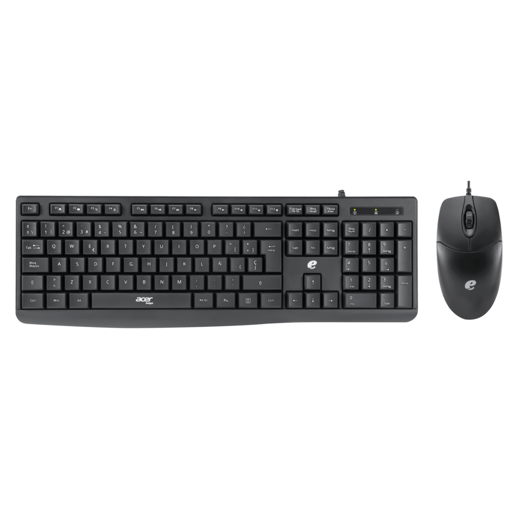 Kit de teclado y mouse Acer EAK040, con conexión USB cableada, diseño ergonómico y acabado en color negro. Ideal para uso diario en oficina o en casa, con teclas silenciosas y mouse de alta precisión.